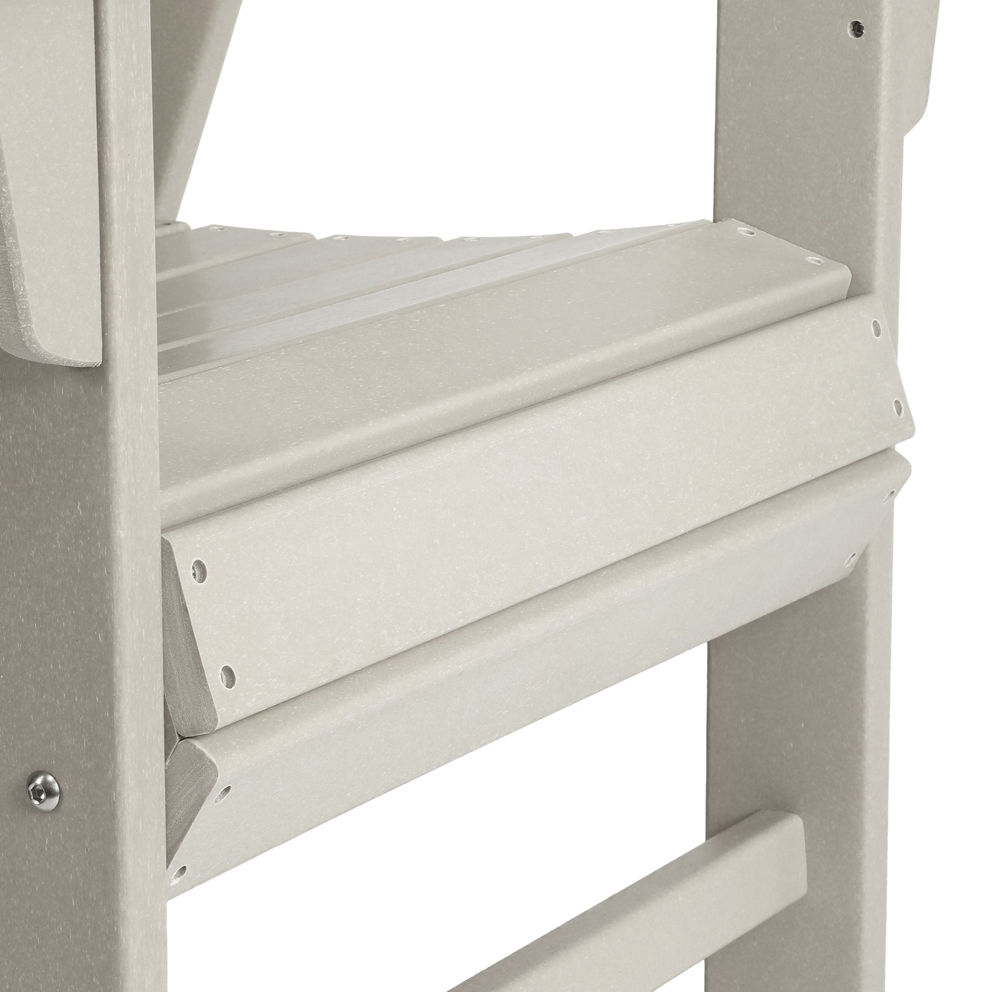 - Chair features oversized seat, curved back slats, and waterfall front