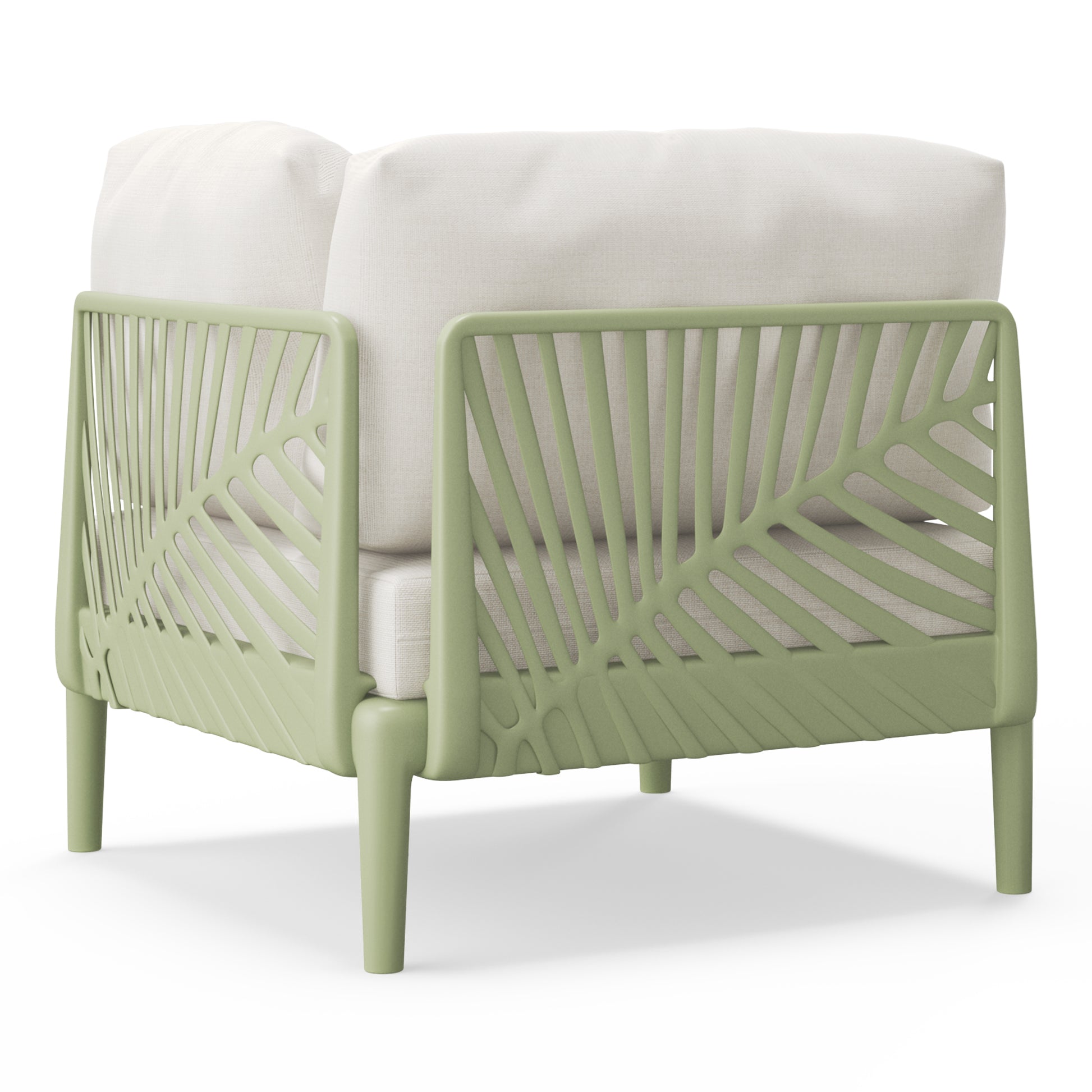 This patio deep-seating corner club chair furnishes your home with a modern, artistic flair, creating lasting memories. It becomes the focal point of any outdoor space with its comfortable cushions, cheerful frame color, and contemporary design. The frame is crafted from durable high-quality, UV-resistant, and fade-resistant polypropylene resin that is perfect for the outdoors, While the plush and thick cushions are filled with extra high-density foam that offers long-lasting comfort and support, ensuring they maintain their shape and resilience for years to come, and the covers are removable via an easy-access zipper and machine washable for effortless cleaning. All designs are focused on providing an exceptionally comfortable experience. The seat is a generous 27.5 inches wide and deep, inviting you to relax and enjoy your time. The chair's design also incorporates a distinctive palm leaf pattern, bringing a touch of nature to your space