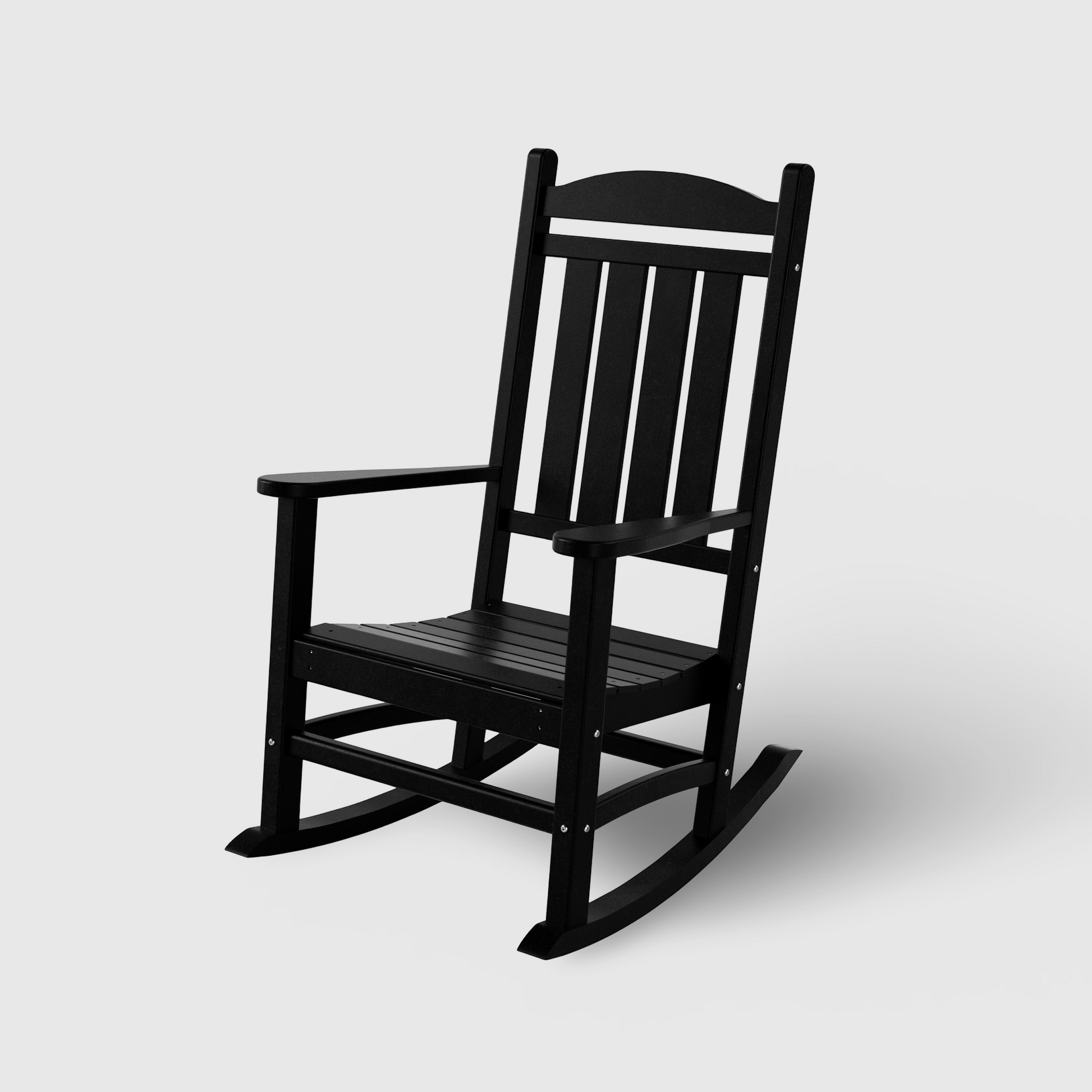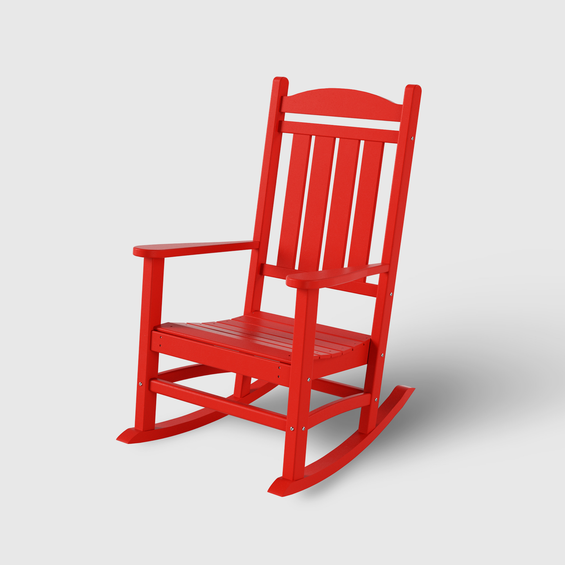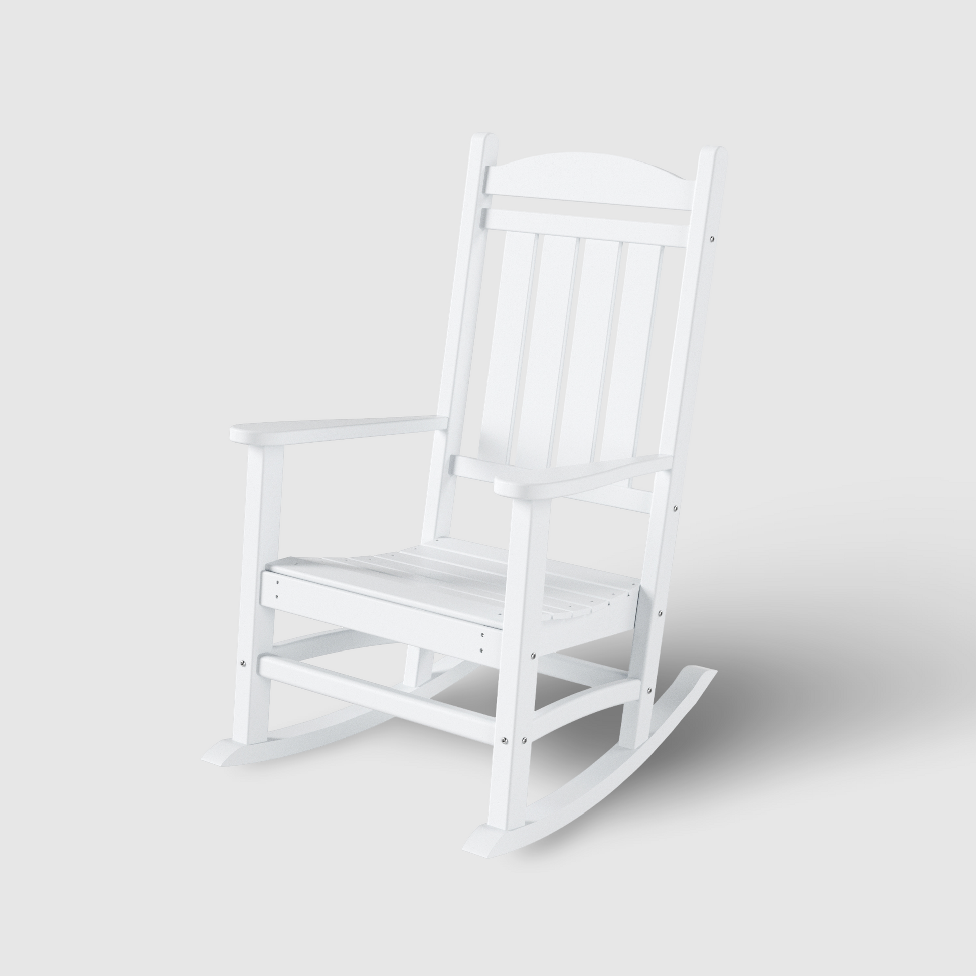 What's the perfect outdoor seat for enjoying a sunny day and watching the world roll by? It's gotta be an iconic rocking chair! A porch rocker like this is perfect for a classic seat in your outdoor ensemble. Crafted from solid poplar plastic with a UV-resistant finish, this piece features spindle designs on the legs and braces for a traditional touch. Slat construction on the curved seat and back lend this piece additional classic touches.