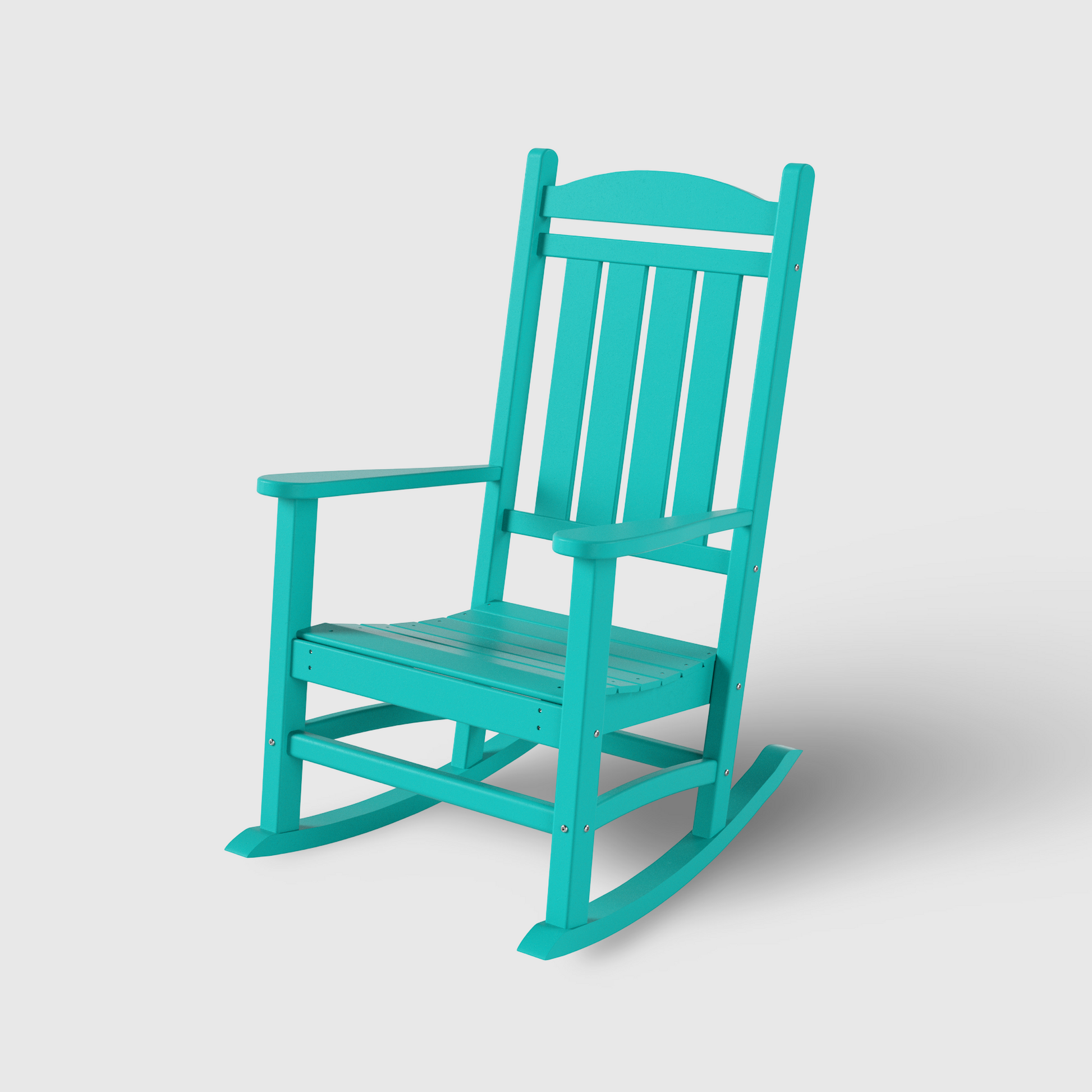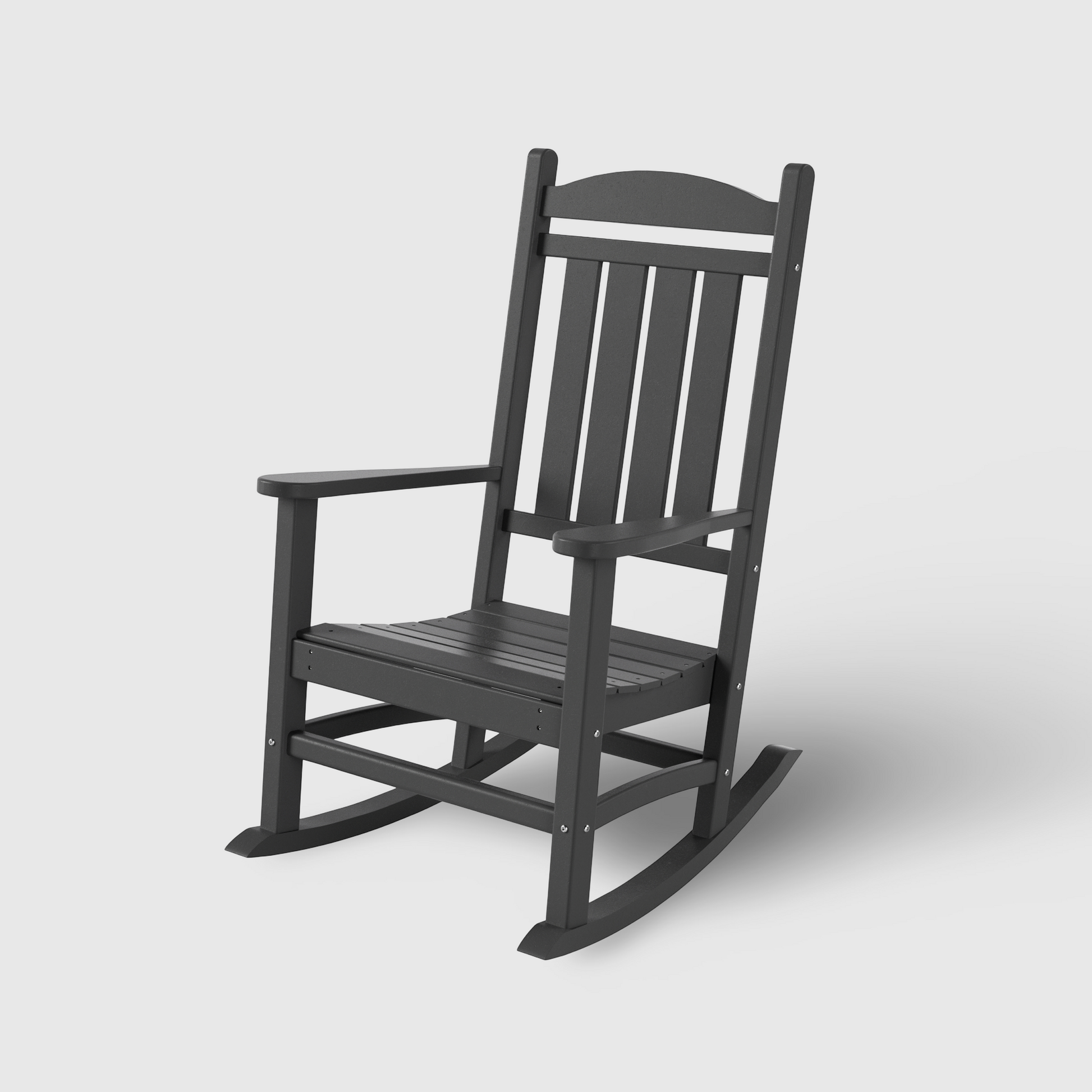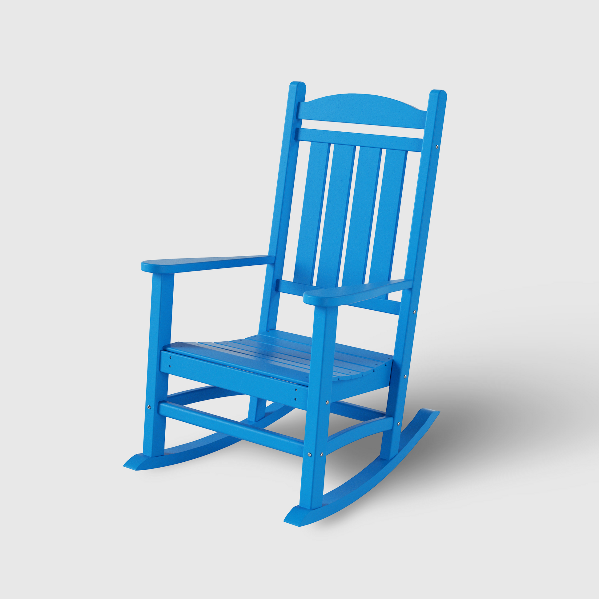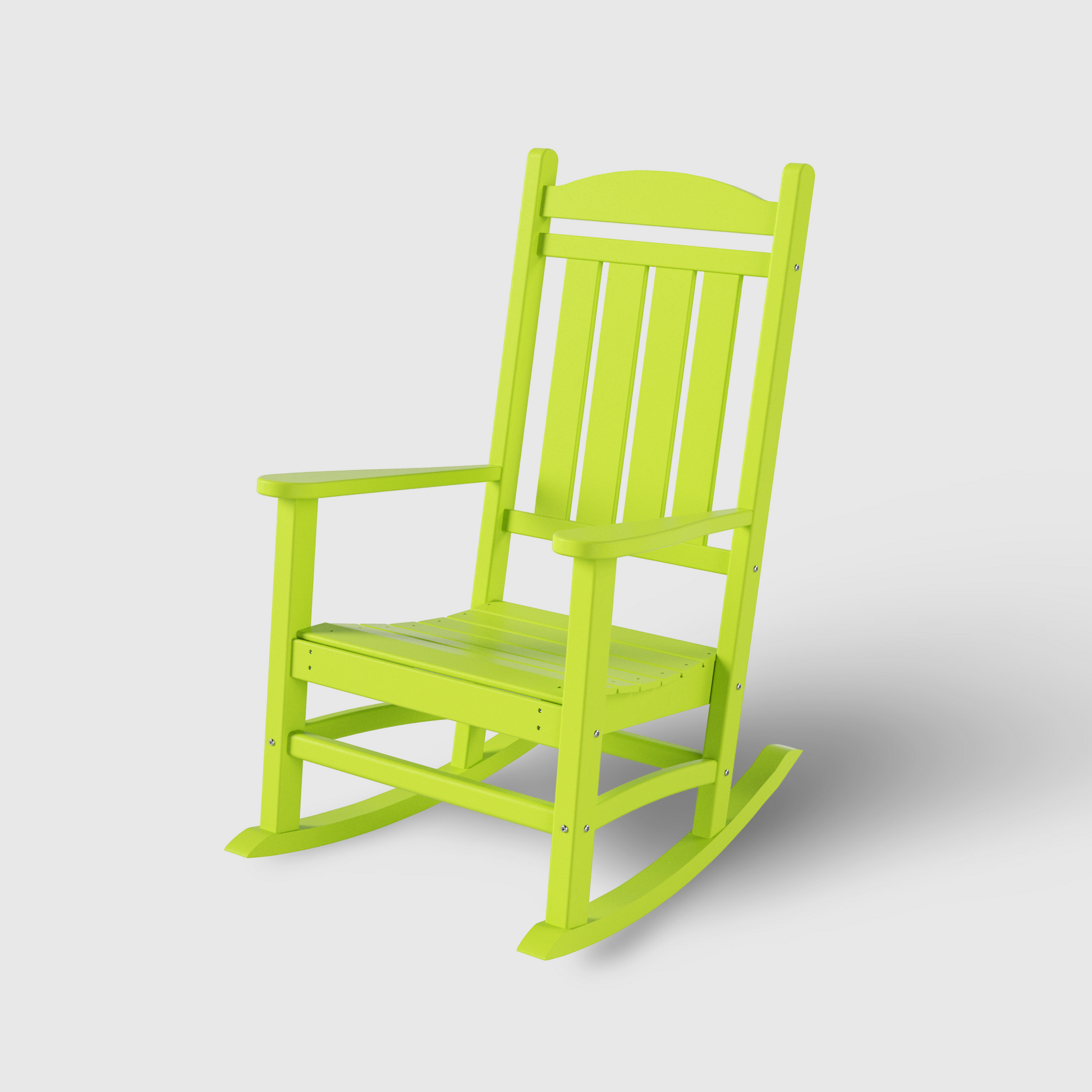 What's the perfect outdoor seat for enjoying a sunny day and watching the world roll by? It's gotta be an iconic rocking chair! A porch rocker like this is perfect for a classic seat in your outdoor ensemble. Crafted from solid poplar plastic with a UV-resistant finish, this piece features spindle designs on the legs and braces for a traditional touch. Slat construction on the curved seat and back lend this piece additional classic touches.