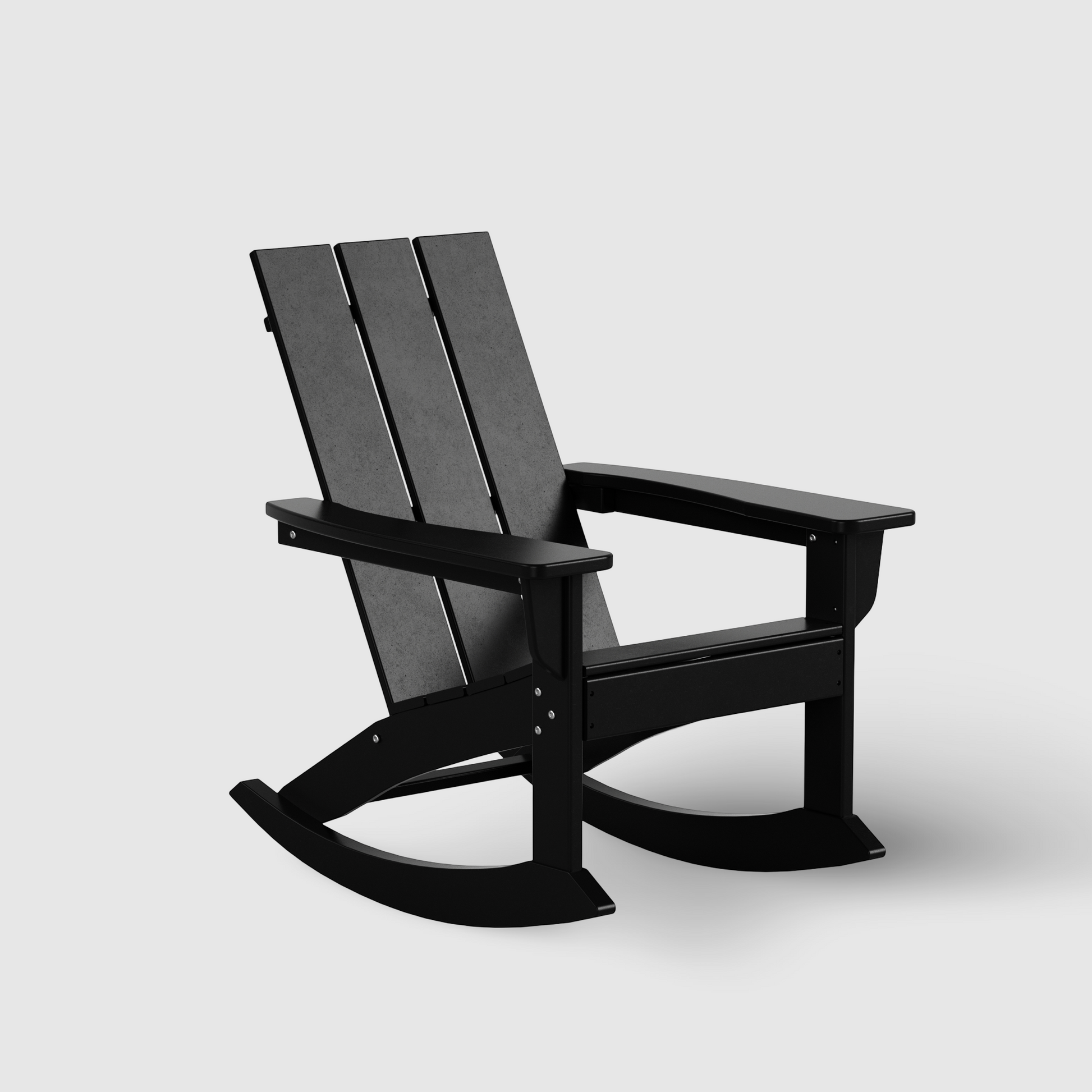 Lay back and relax and in comfort with this simple yet modern rocking Adirondack chair. Sleek in design with it's flat black paired with the wide armrest to lay out your arms and smooth rocker rails that will rock you into a soothe and gentle nap during those warm days. Crafted out of a durable HDPE material that is resistant to harmful UV rays and the outdoor weather elements making it the perfect chair for the outdoors without having to worry about damaging the chair.
