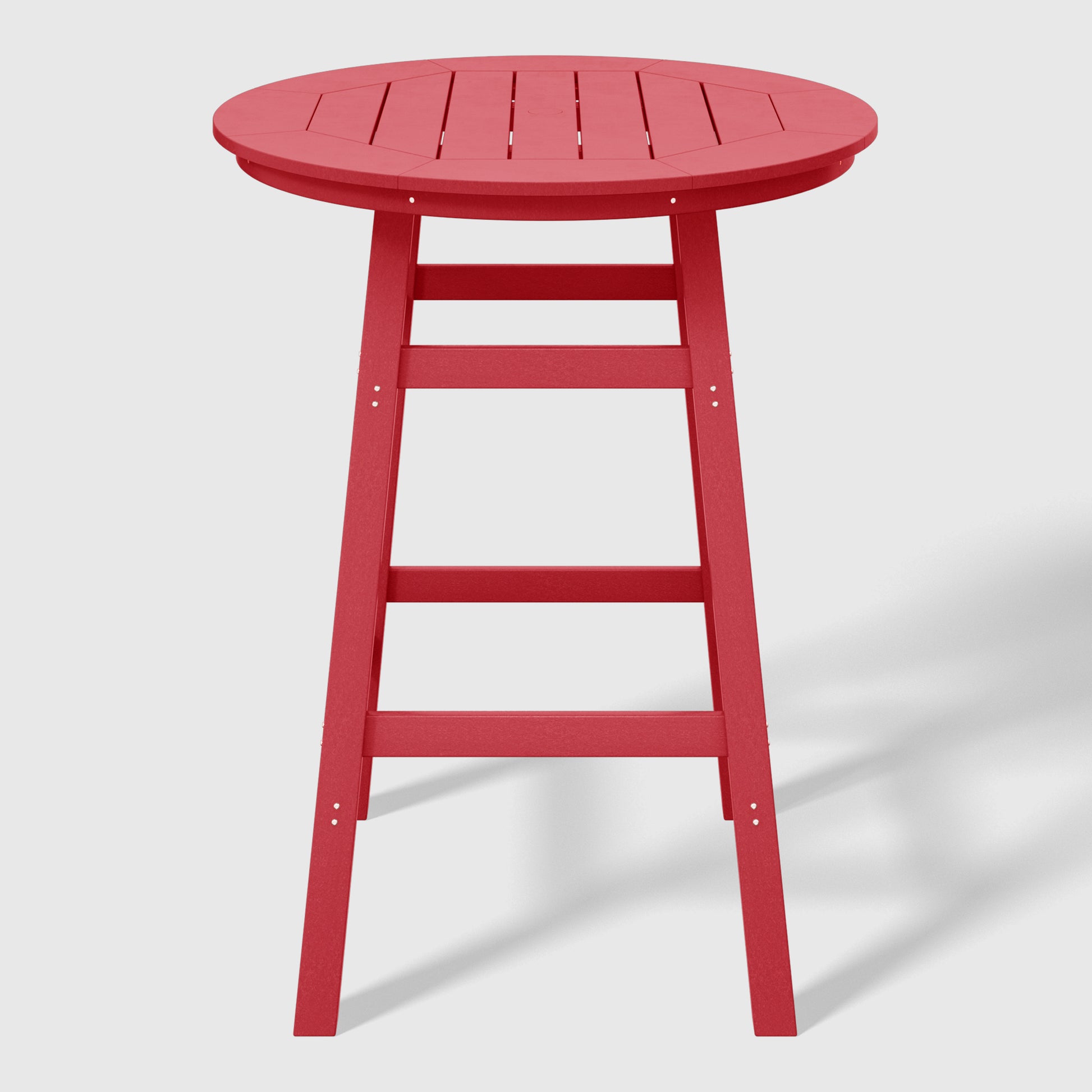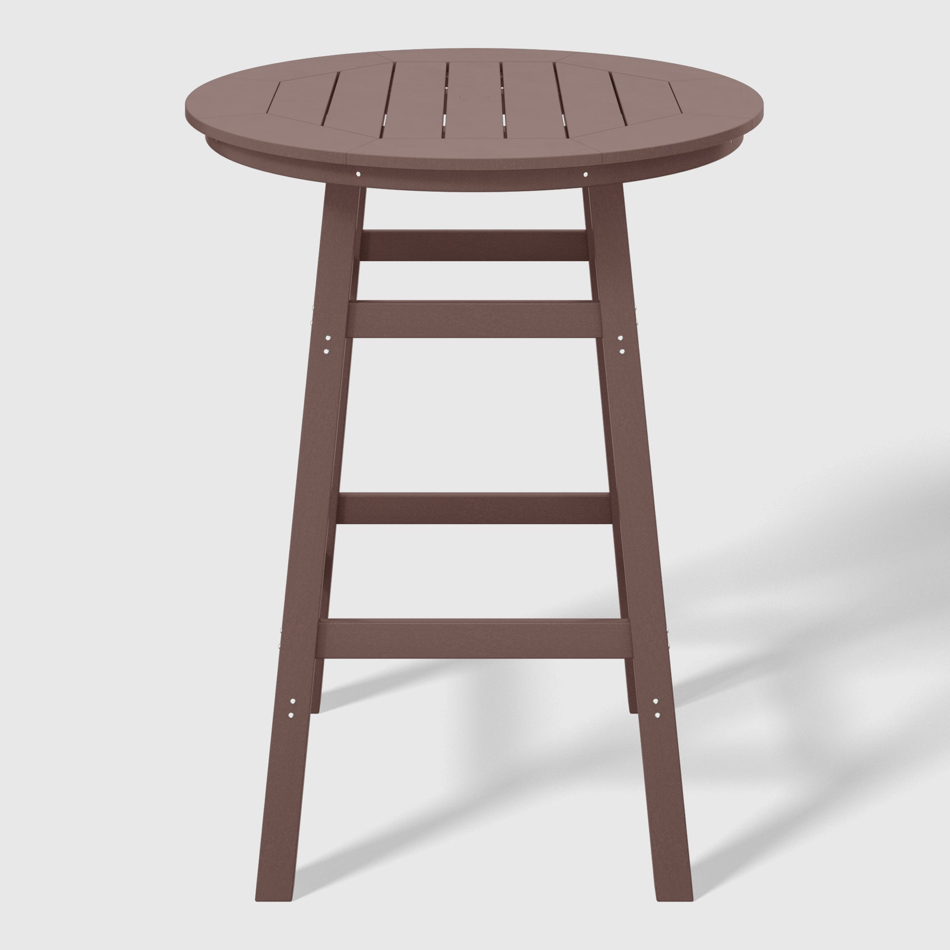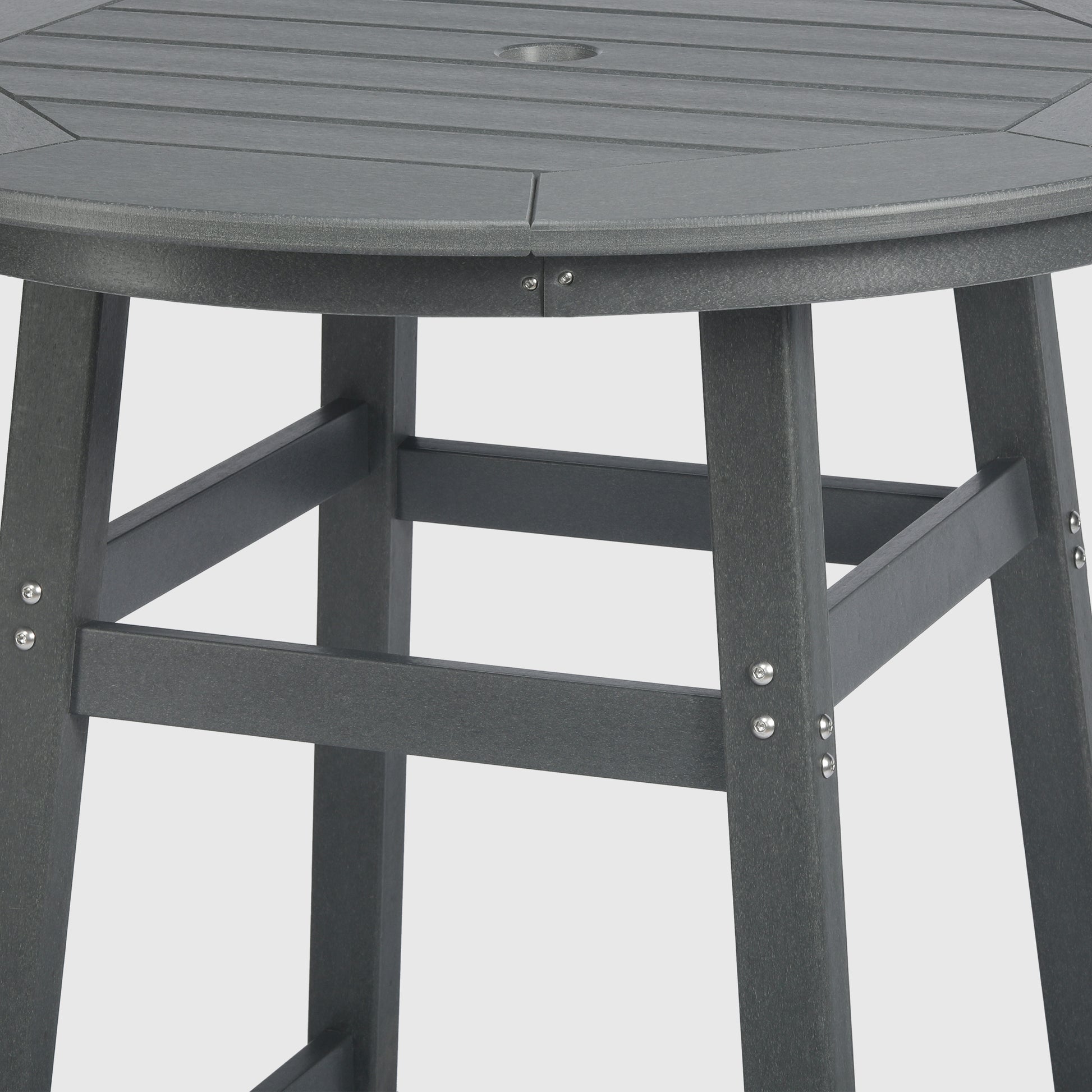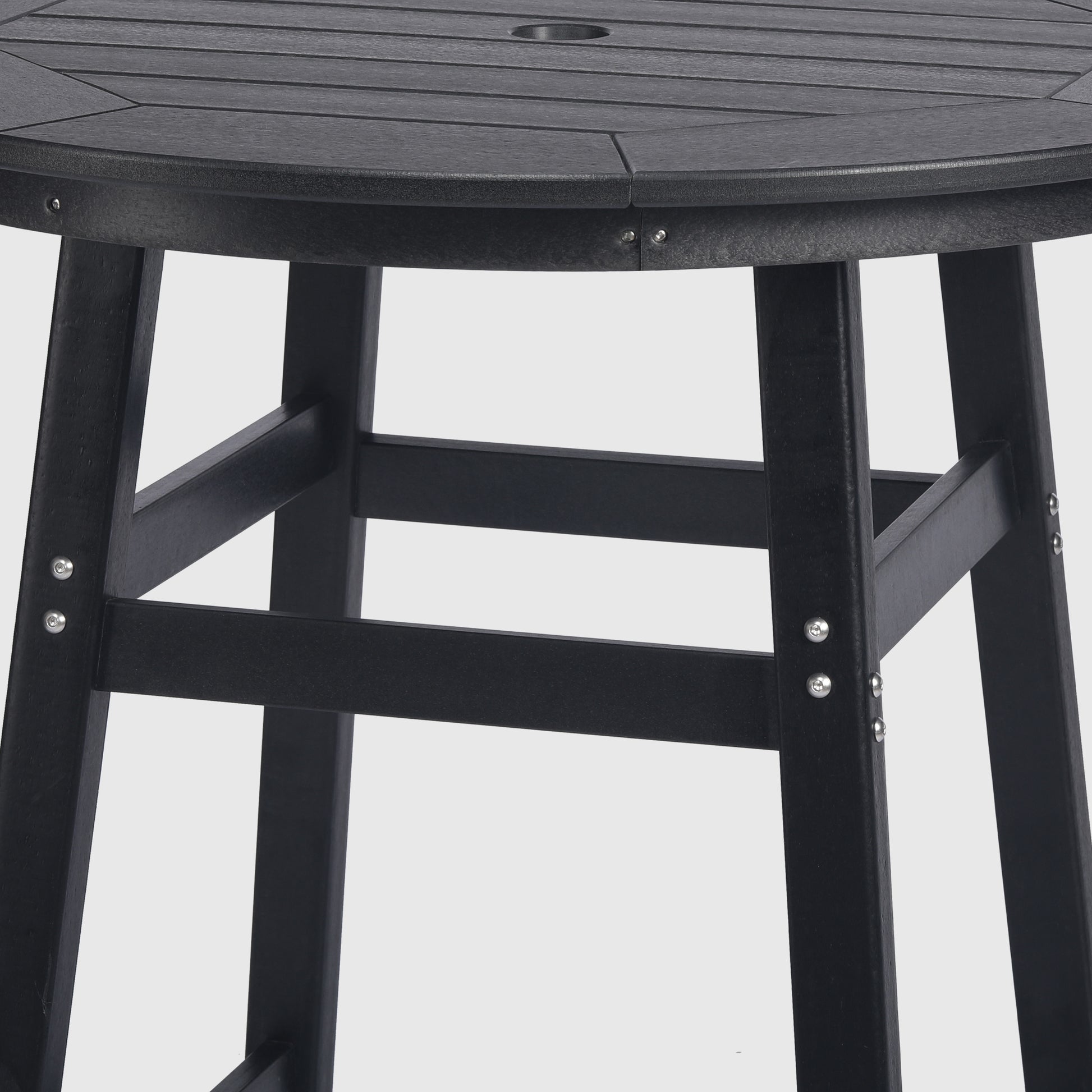This 35" Round Bar Table is an excellent choice for al fresco dining in the garden or your backyard bar patio. All-weather-resistant materials that is perfect to prevent damage from the outdoor elements. Enjoy hosting friends and family all year round with this durable HDPE material that is UV and fade resistant to protect your beautiful bistro bar table from the strong UV rays and prevent fading and damage. The slatted and octagonal inner tabletop design, paired with the round shape, adds a touch of character to your bistro bar table and has an umbrella hole to place any standard-sized umbrella. The perfect bistro bar table to gather around with your loved ones and friends this spring.
