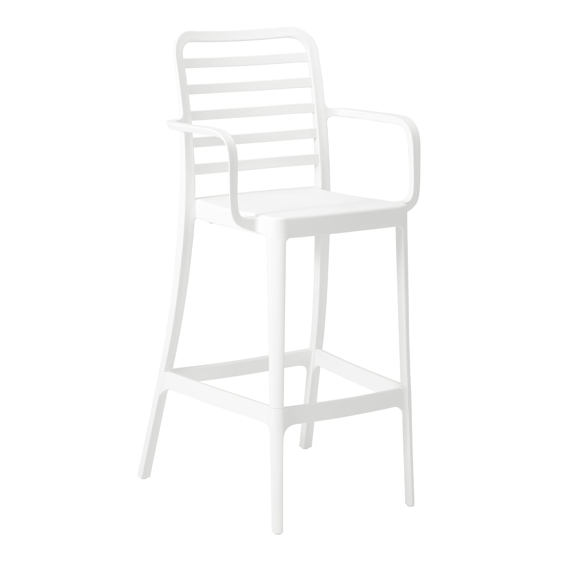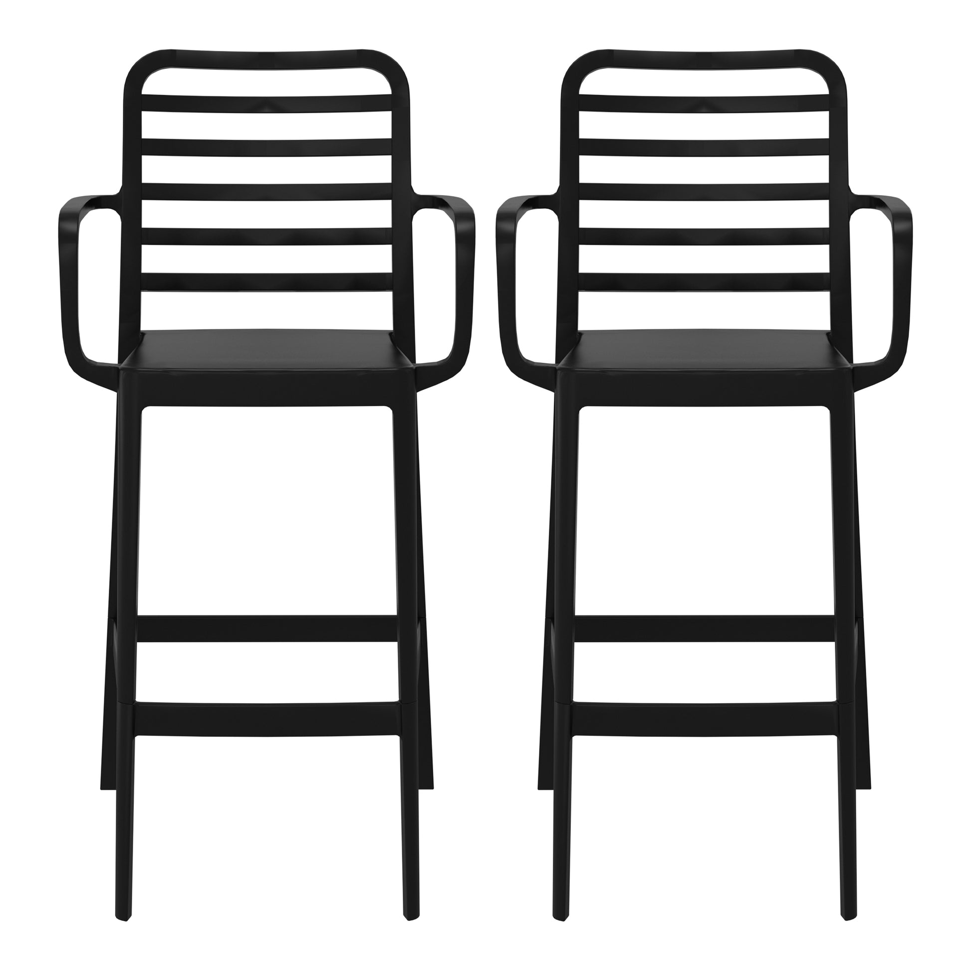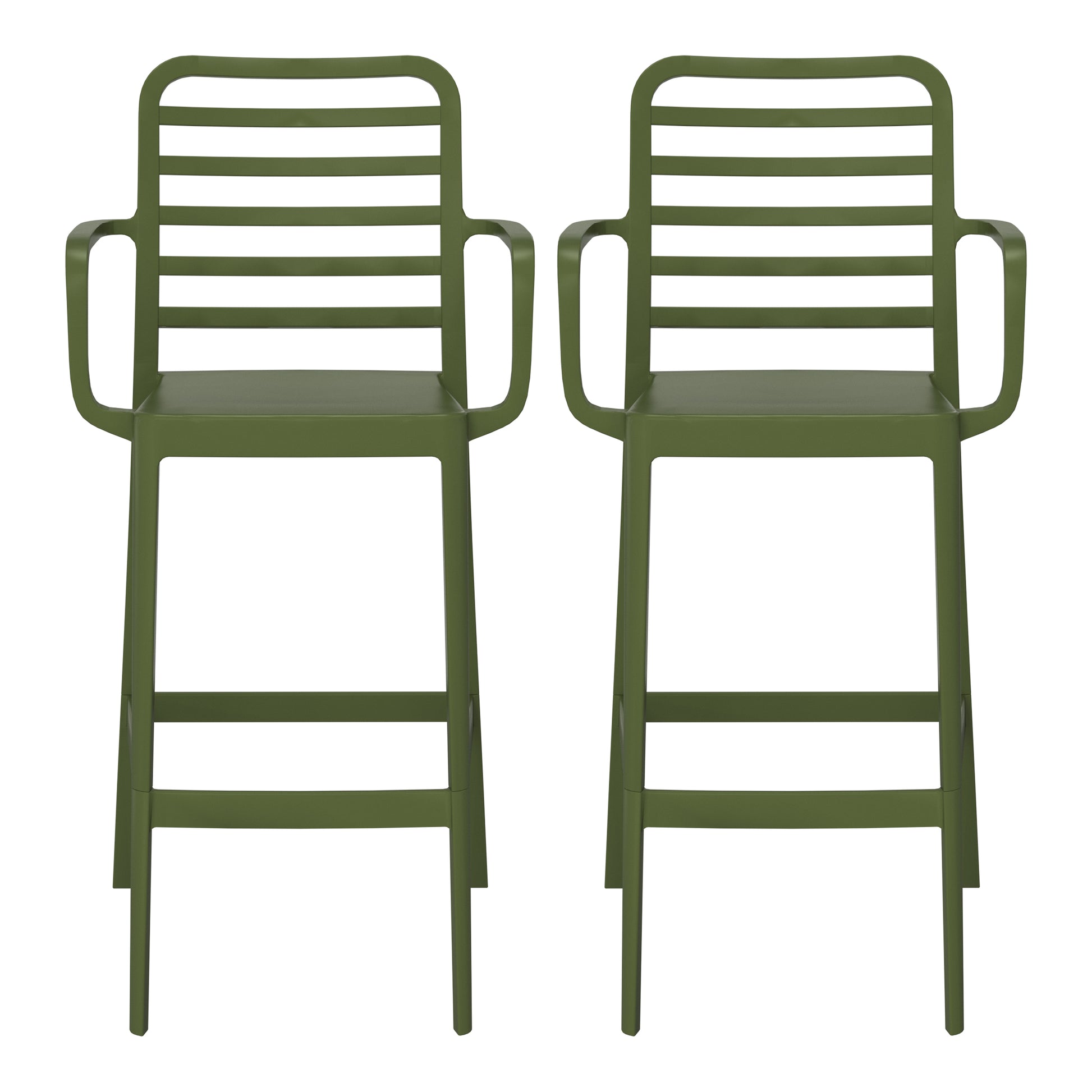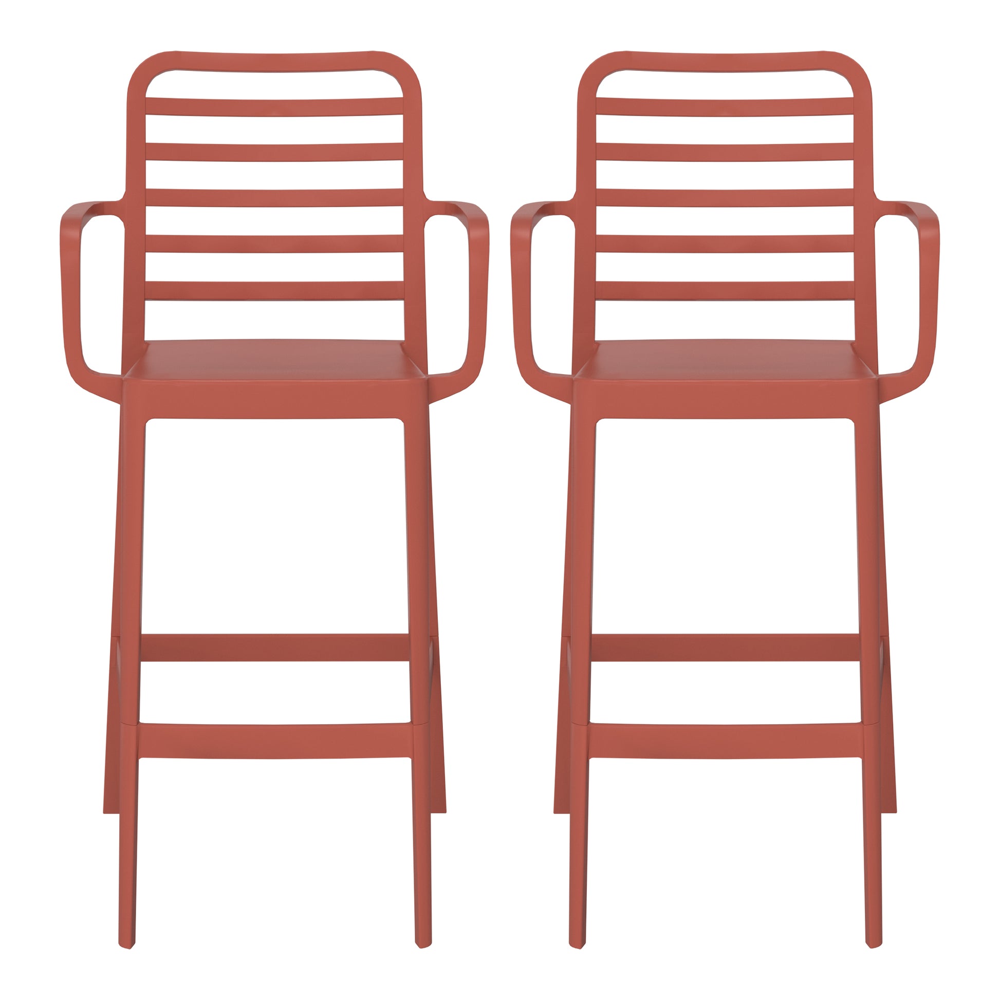 Add charm and vibrant style to your balcony or terrace with this set of two versatile outdoor bar stools. Crafted from durable, all-weather Polypropylene (PP) resin, these 29.5-inch high stools are designed to withstand the elements, maintaining their rich color year-round thanks to UV and fade-resistant properties. Lightweight and easy to move, they're perfect for creating a flexible dining or entertaining area, even in small spaces. A ventilated backrest ensures comfort on warm evenings, and a convenient footrest provides added support. Splayed back legs add stability. For added versatility, the bottom half of the base is removable, allowing these bar stools to convert into standard dining chairs. When disassembled, they offer a more compact storage solution.