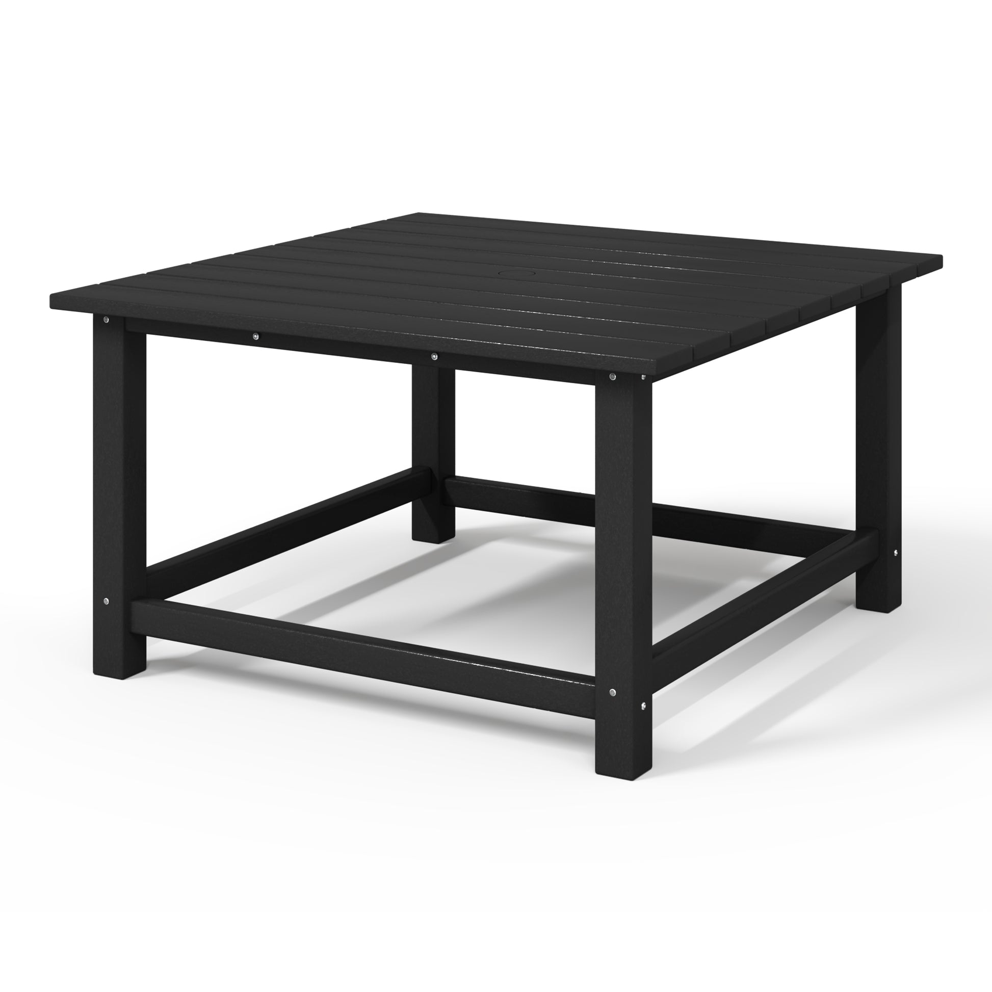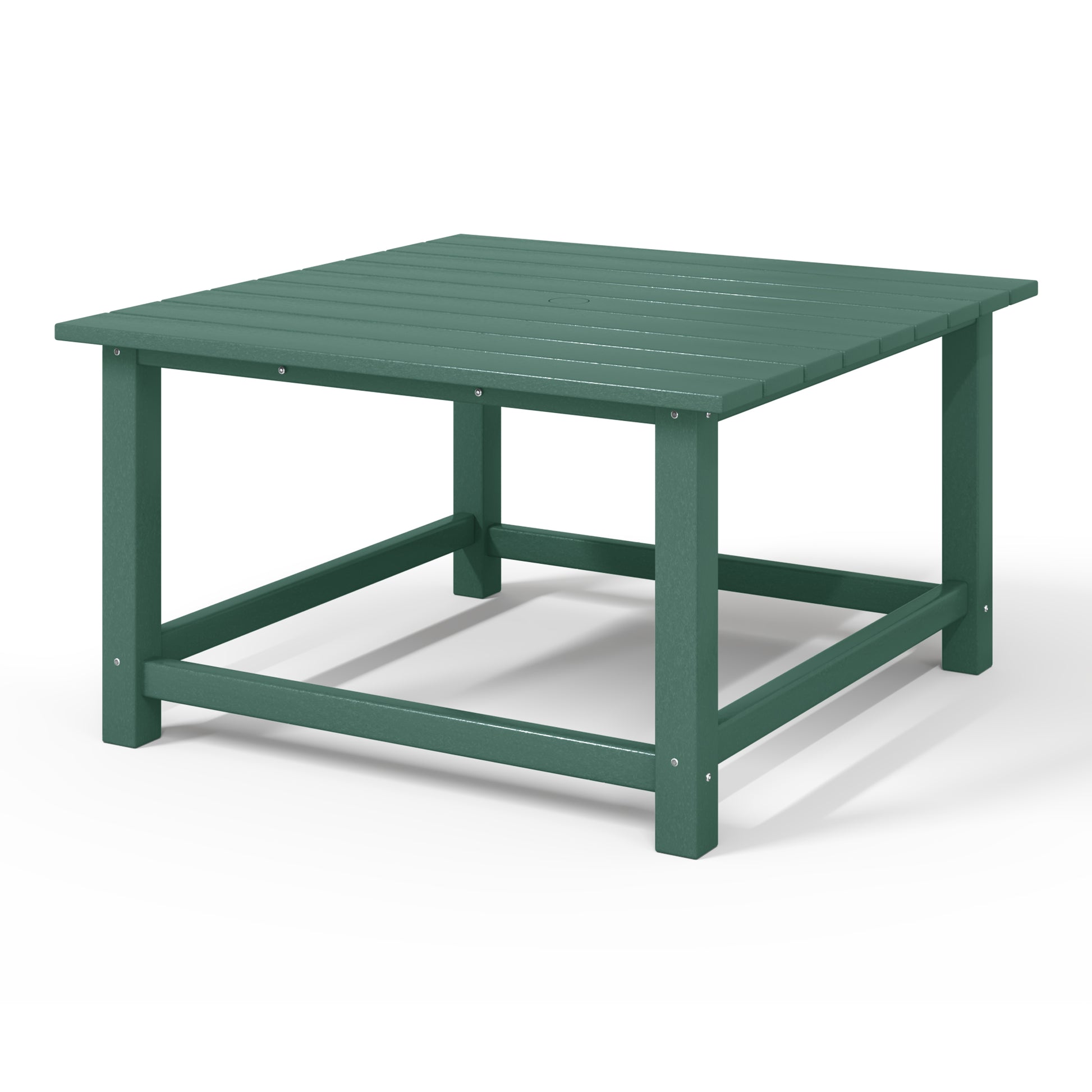 Create a warm and inviting space with our charming 31" Inch Wide Outdoor Square Patio Coffee Table. Made from a durable HDPE material that is perfect for the outdoors with its all-weather resistant material that is UV and Fade-resistant to help protect from the harsh sun and to help keep that vibrant color season long. Crafted for comfort and functionality with rounded and smooth edges that help prevent scratches or bruises and the center umbrella hole that can fit 1.5" inch diameter umbrella poles.